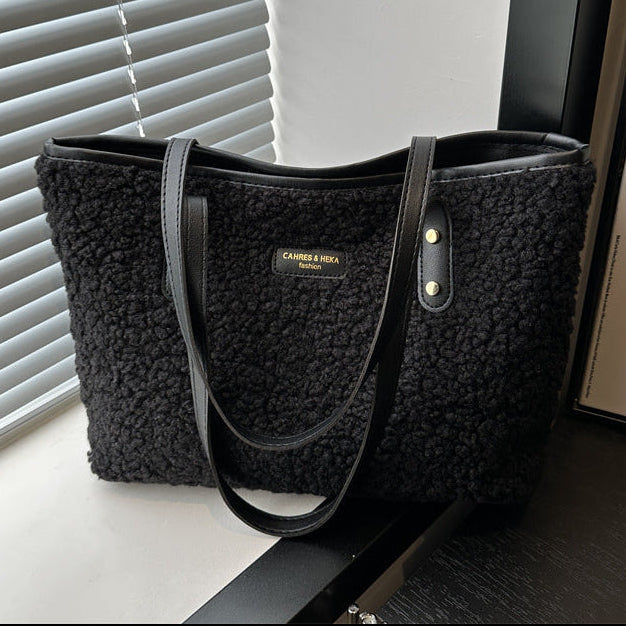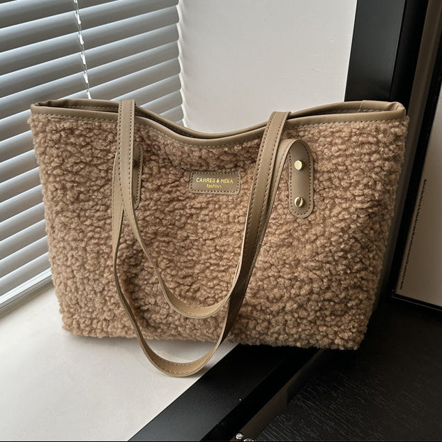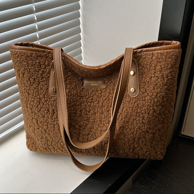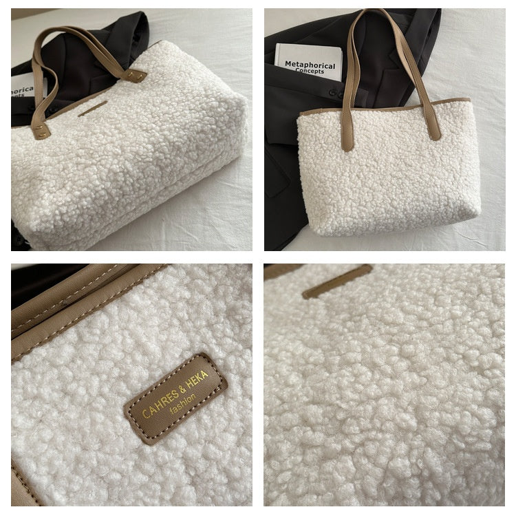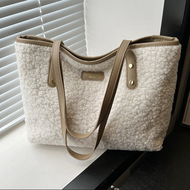 A cozy statement tote designed for everyday wear with a soft, textured finish. Crafted from plush cotton sherpa material, this handbag combines a relaxed silhouette with practical capacity, making it ideal for daily essentials. The contrasting handles and subtle color-block details add a retro-inspired touch that pairs effortlessly with casual and urban outfits.