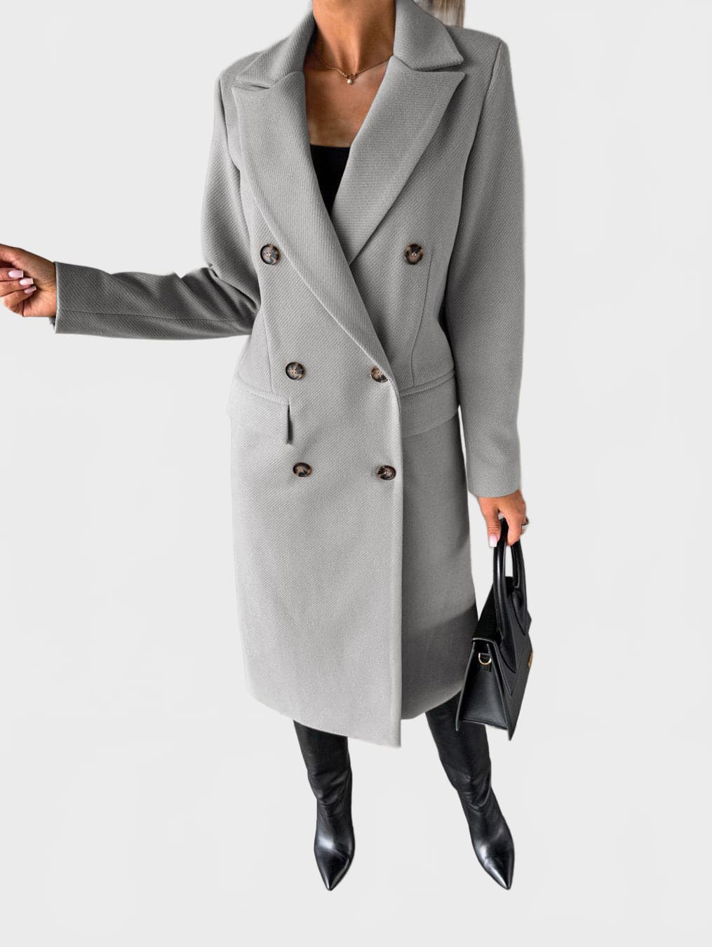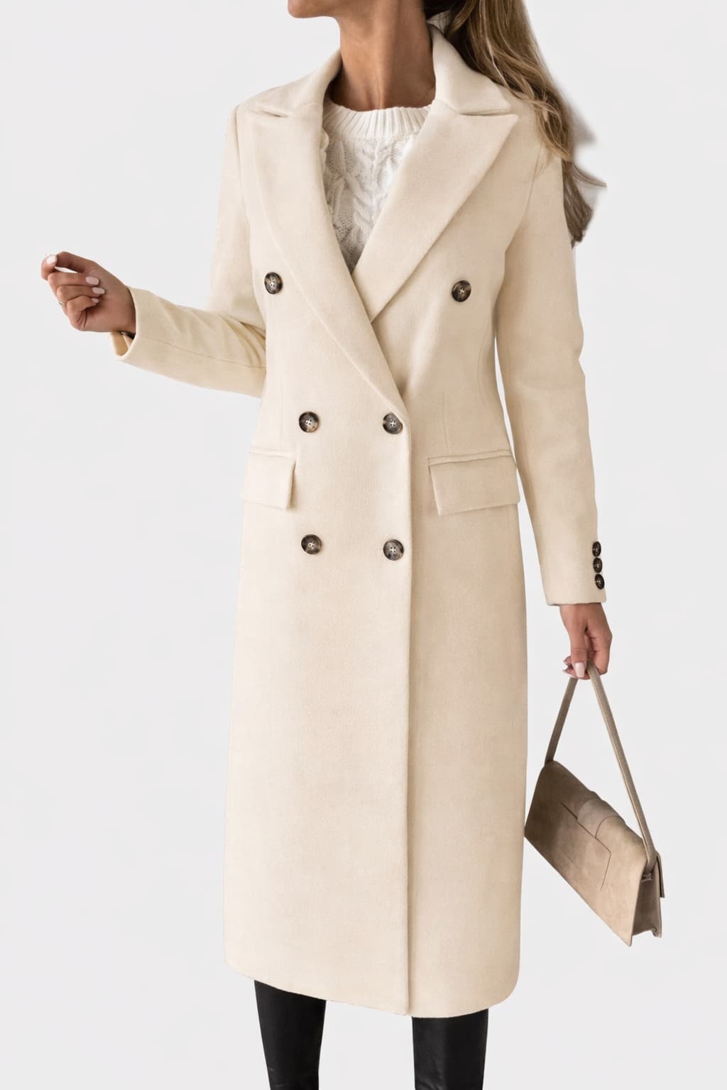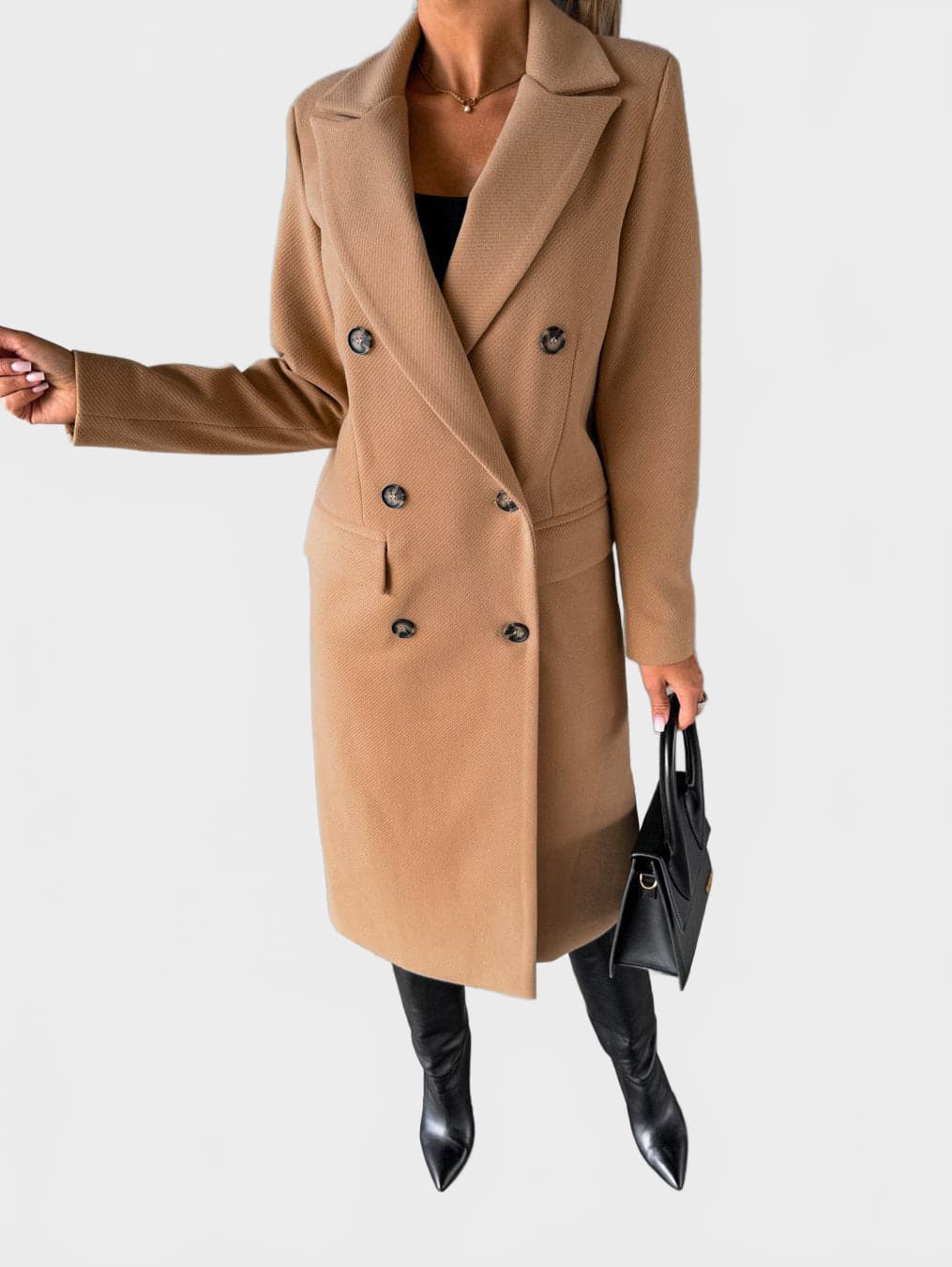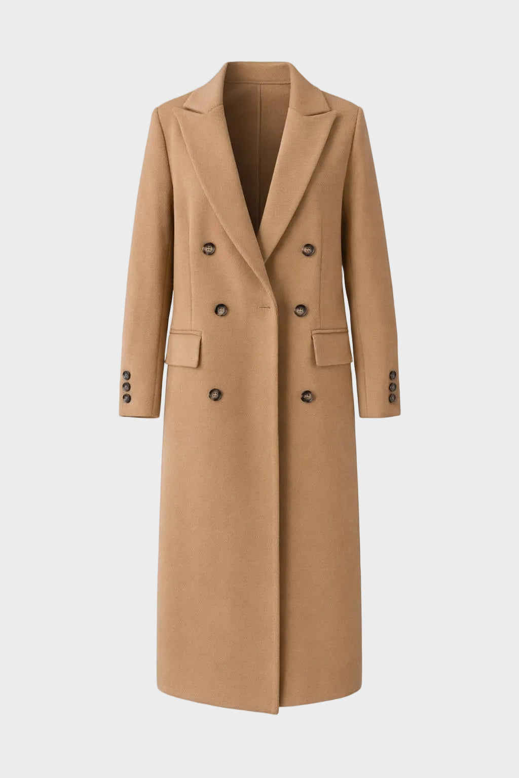 A refined double-breasted coat designed for a confident, modern silhouette. This structured long coat features a classic lapel collar, clean lines and a smooth finish, making it ideal for both everyday wear and elevated city looks.