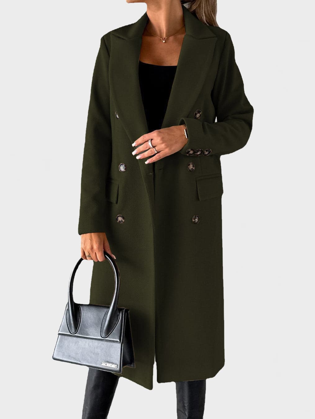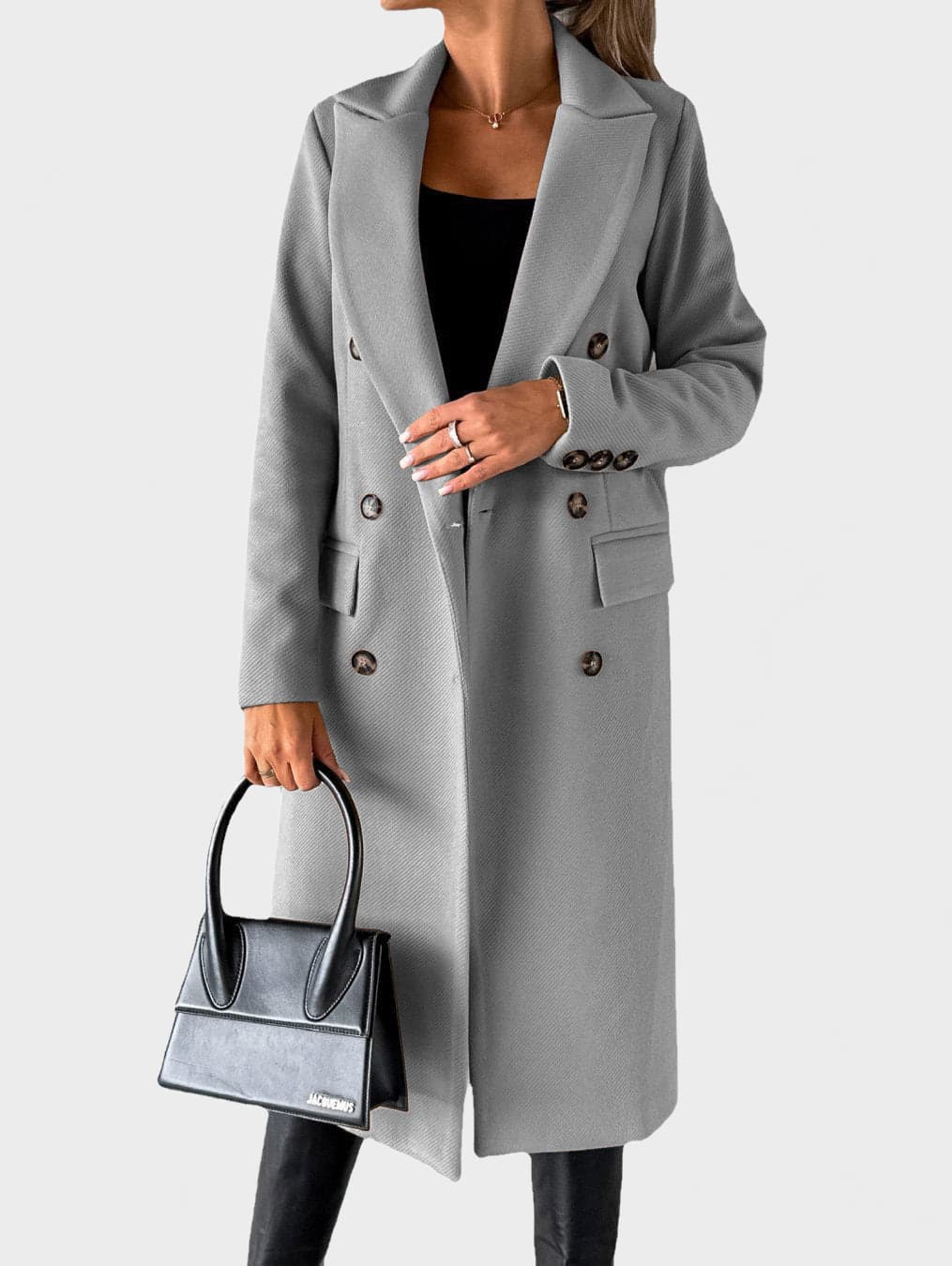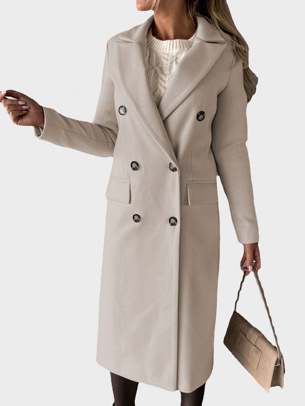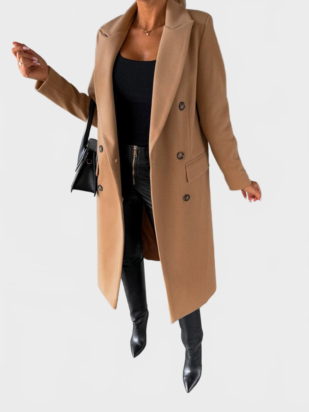 A refined double-breasted coat designed for a confident, modern silhouette. This structured long coat features a classic lapel collar, clean lines and a smooth finish, making it ideal for both everyday wear and elevated city looks.