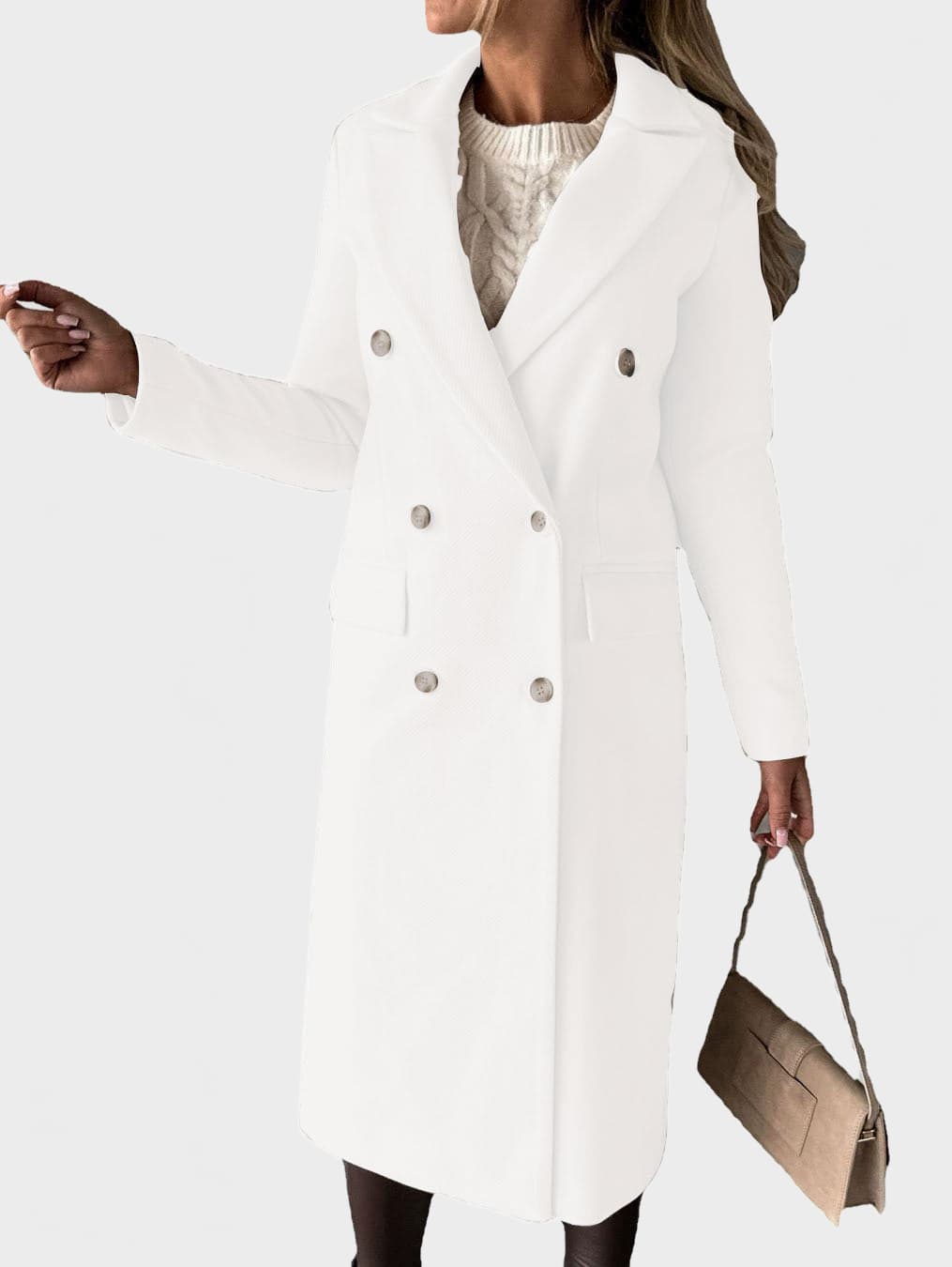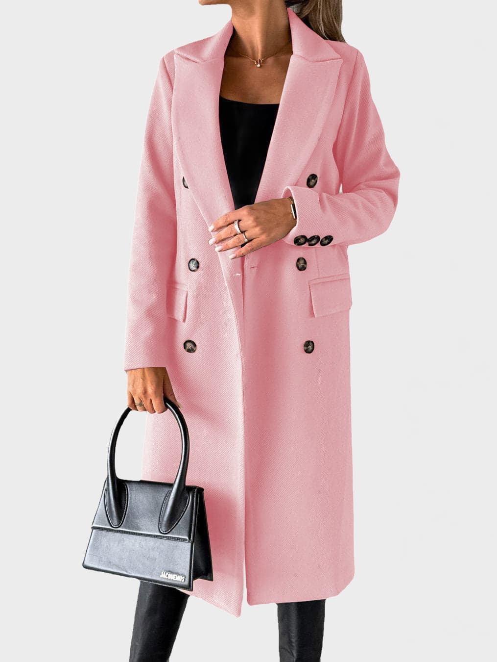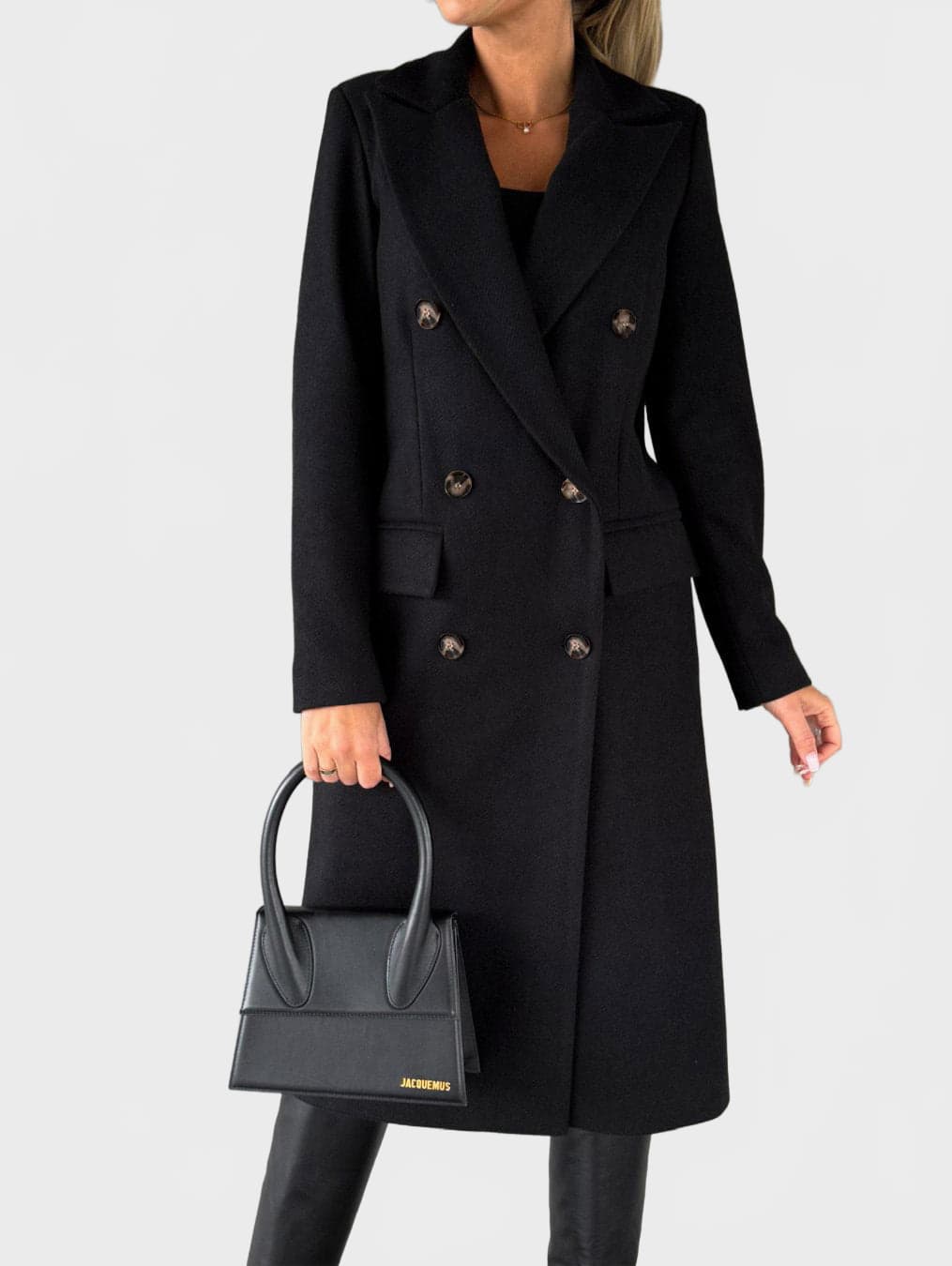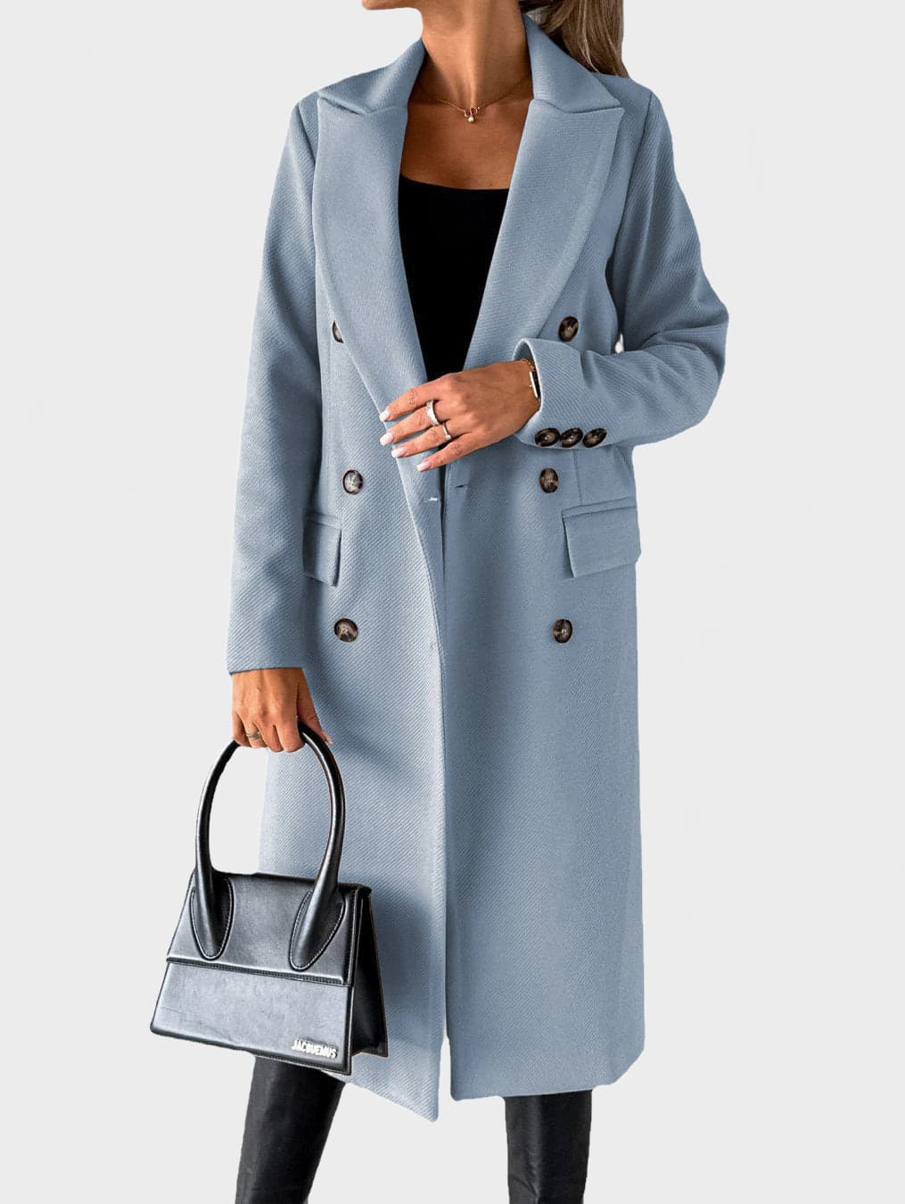 A refined double-breasted coat designed for a confident, modern silhouette. This structured long coat features a classic lapel collar, clean lines and a smooth finish, making it ideal for both everyday wear and elevated city looks.